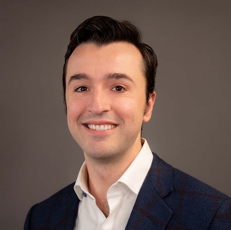 Jack Loesch smiling, wearing a suit and blue tie against a gray background.